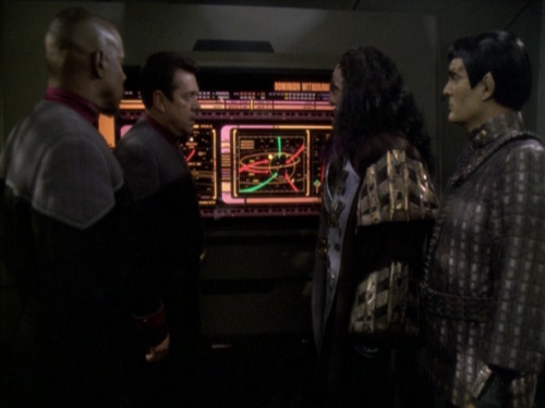 Einige Wochen später besucht eine Delegation der Romulaner DEEP SPACE NINE. Die Romulaner wollen die gesammelten Informationen der Föderation, welche diese in den letzten Monaten über das Dominion gesammelt hat. Diese Daten fordern die Romulaner im Austausch gegen die Tarnvorrichtung der DEFIANT. Die Romulaner sehen im Dominion die größte Gefahr für den Alpha-Quadranten in den letzten 100 Jahren. Die Romulaner erhalten von Commander Sisko und Major Kira sämtliche Informationen über das Dominion. Doch die Romulaner sehen trotz dieser Daten nur eine Möglichkeit den Alpha-Quadrant vor dem Dominion zu schützen. Die Romulaner planen nun einen Angriff auf DEEP SPACE NINE und das Wurmloch, damit das Dominion nicht in den Alpha-Quadranten eindringen kann. Dabei planen die Romulaner, dass es nach einer Instabilität des Wurmloches aussieht, welche für diese Katastrophe verantwortlich ist. Die Romulaner können jedoch Dank der Hilfe von Chief O´Brien aufgehalten werden, der durch eine Strahlenverseuchung zeitweise temporale Sprünge durchlebt.