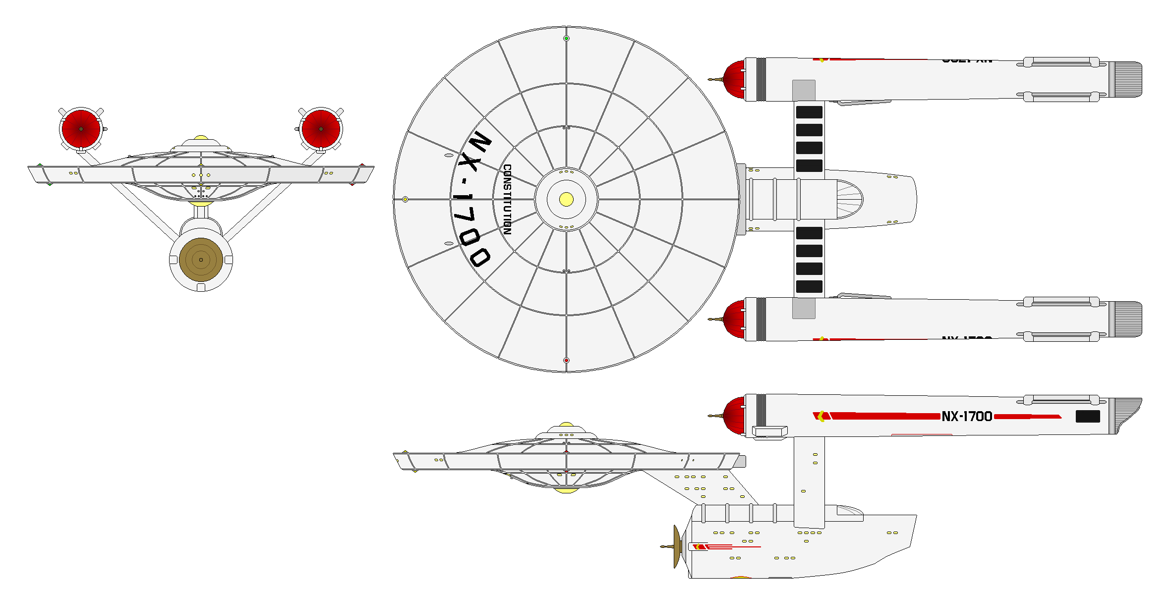 The first newbuild production based upon the finalized form of the Republic, along with a few innovations slipped in, Constitution (NX-1700) was authorized for construction as a prototype in May of 2239. The Chiokis saucer from the Siva subclass was adopted; though the saucer was less voluminous in internal space, the embedded deflector plating was well-tested and highly expected to fare well in combat situations. The saucer’s triple-ported impulse engines provided almost 8% more thrust than the Republic's quadruple set, due to the efficiency of the more compact design. A strengthened interconnecting dorsal provided additional comparative space, some of which was assigned to living quarters, with the remainder to the operations, weapons, and engineering departments. She measured 278.1 meters long, 22.0 on the beam, and a height of 68.3, massing 598,400 metric tons. She was propelled by PB-31 warp nacelles, armed with six 4.0 GW laser emitters, two 1.2 TW phased particle cannons, and one medium torpedo tube, and defended by a 1-layer conformal forcefield, and 4 navigational deflectors. She carried 2 medium (or 4 light) shuttles, 4 shuttlepods, and 4 work pods in the shuttlebay located on the dorsal of the secondary hull.
