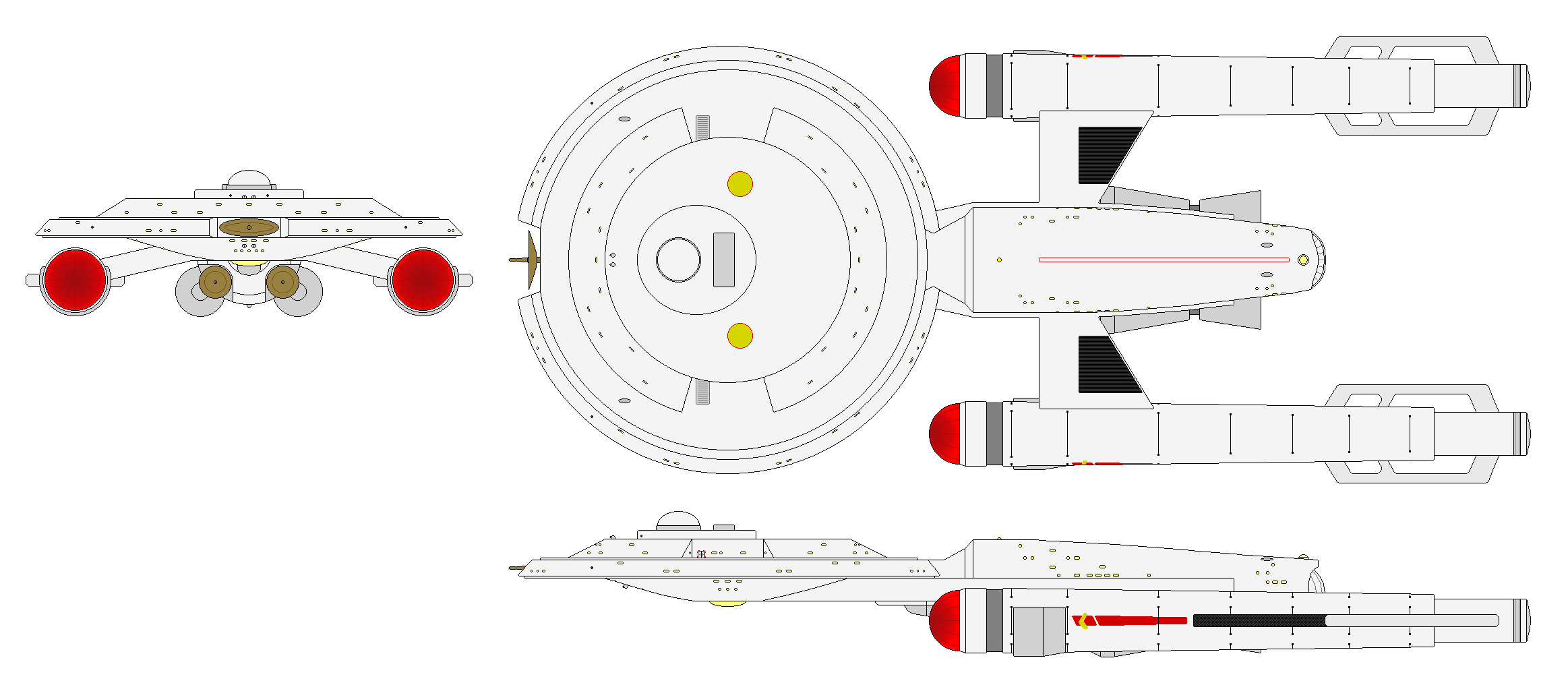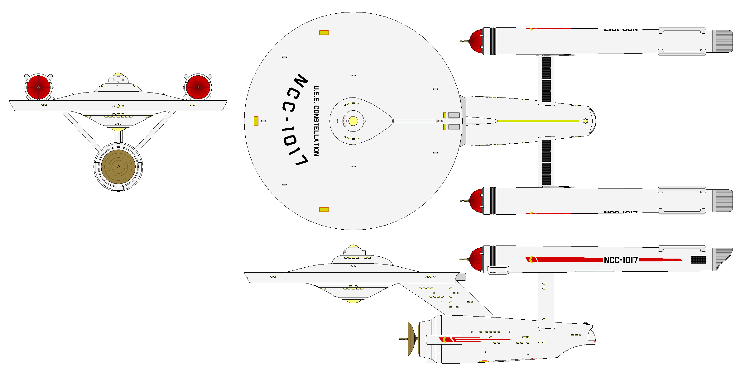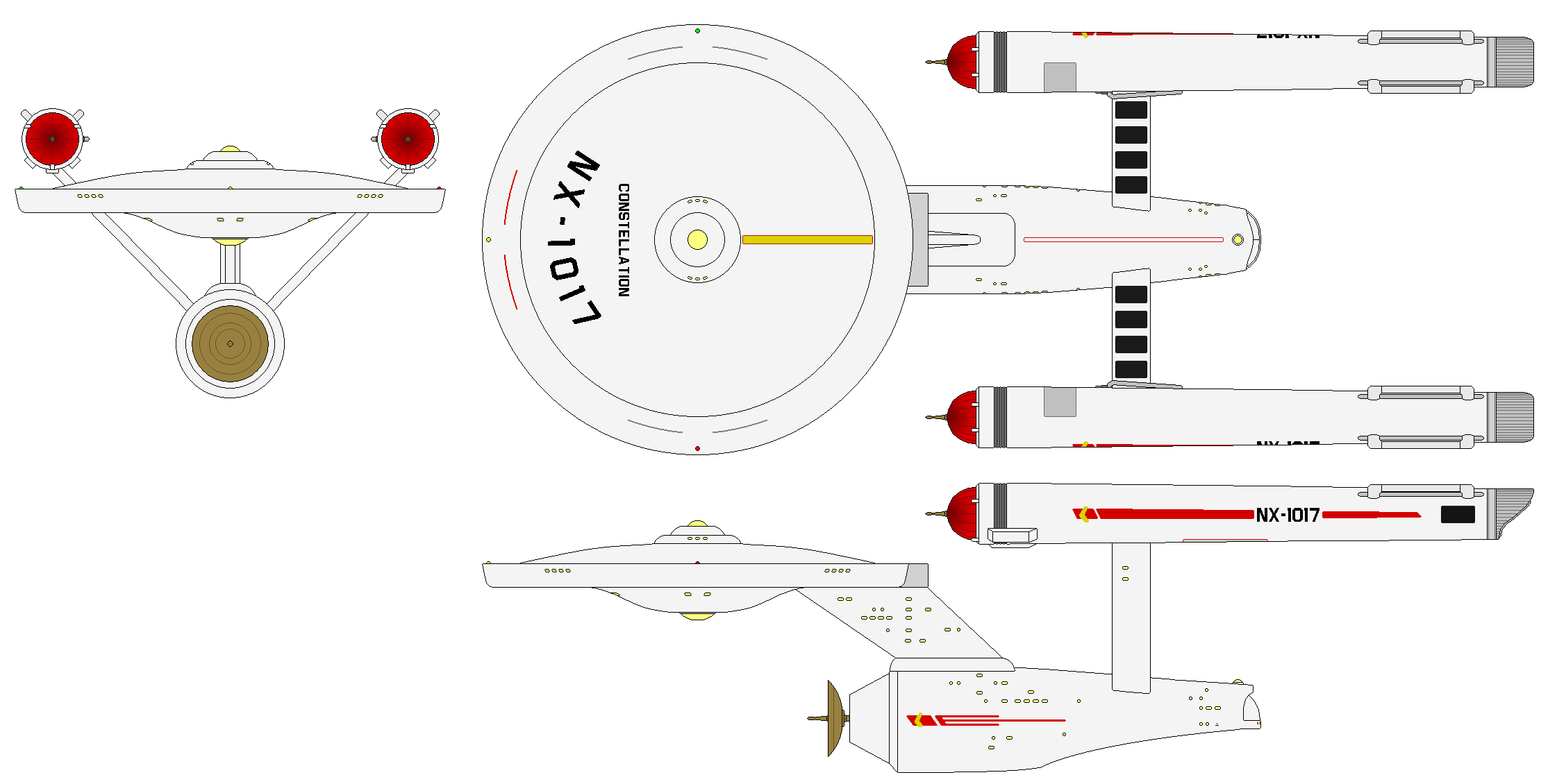 By 2238, the Federation’s first natural dilithium source on Deneva was in the opening stages of full mining and refining of the most critical component of a truly efficient annihilation core, with Star Fleet’s Project Starship a targeted recipient. The NX Constellation had the previous 4:1 matter/antimatter spicing compression fusion powerplant replaced by a custom-fitted dilithium-regulated antimatter reactor and the ship was formally re-activated (though not yet re-commissioned) as NX-1017. The new dual PB-31 warp nacelles were placed in positions elevated and further back than the PB-30As utilized during the fusion testing phase. The pylons were reshaped and lengthened, as was the saucer’s interconnecting dorsal, which added considerable internal volume for machinery, laboratories, and workspaces. In this configuration, she measured 278.8 meters long, 114.1 on the beam, and a height of 76.9, massing 595,000 metric tons.