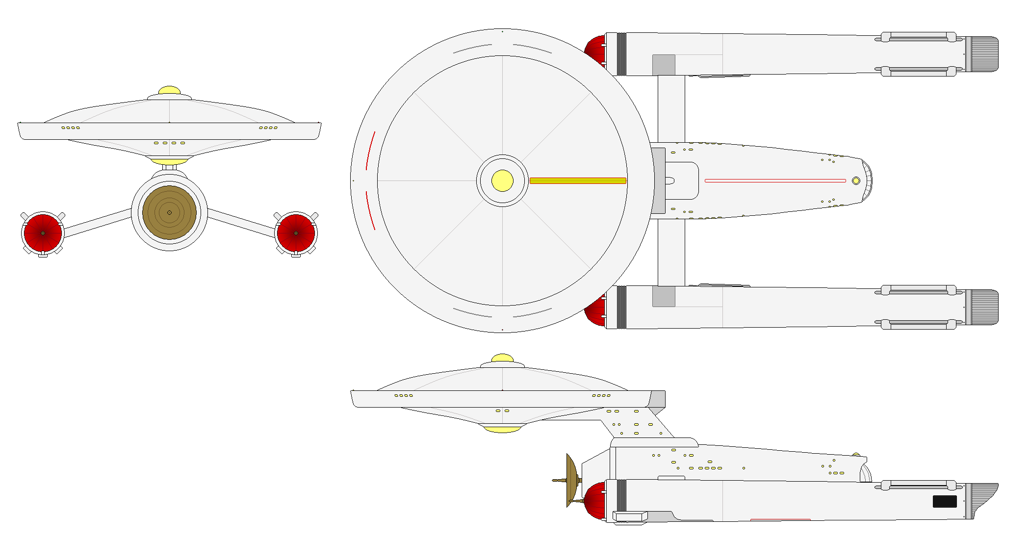 Despite her experiences in the Battles of (First) Axanar, Lea, and Donatu V, the "Connie"'s development team sincerely believed she would be setting the standard for the Project Starship newbuilds ordered but yet to come. They knew that the nearly-featureless Enterprise in a bay across the shipyard was the closest competitor, but they were confident they could both repair the battle damage and upgrade to the now-battle tested standards before the sister ship would be completed. In the three-year race to follow, the team was almost right. They received permission to rebuild the devastated Siva-class saucer with which she had originated to the new specifications, and also argued (successfully) to retain the four Siva impulse engines, saving considerable reconstruction time. Other than being slightly less-armed (she fared very well with her present combat systems) and just over 19,100 metric tons more massive, she was identical externally to the new standard. However, to honor her valiant efforts during the recently concluded war and acknowledge that it is generally the lead newbuild ship that loans the name to the class, “Constitution” was chosen for the heavy cruisers’ shared name. She would remain in this configuration until converted into a Flight II in the 2250s.