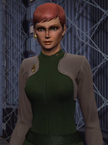 In 2405, now a lieutenant junior grade, she volunteered for front-line service in the Federation-Klingon War but was instead assigned to Deep Space 9 to work as a liaison with the Militia. Six months later she was reassigned to the USS Kagoshima as second shift weapons officer under Captain Alfred Detweiler.