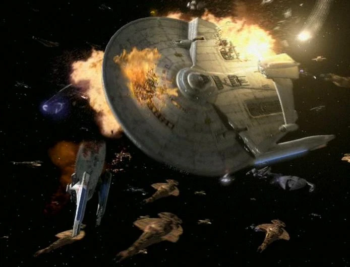 Once inside the Dominion formation the Federation fleet's formation fell apart due to communications jamming by the Dominion. For two hours the Federation fleet battled on before the surprise arrival of Klingons reinforcements. The Klingons blasted a hole into the Dominion formation allowing the USS Defiant to break through. With time running out and no other ships also through the Dominion lines the Defiant made its way toward Bajor, alone.