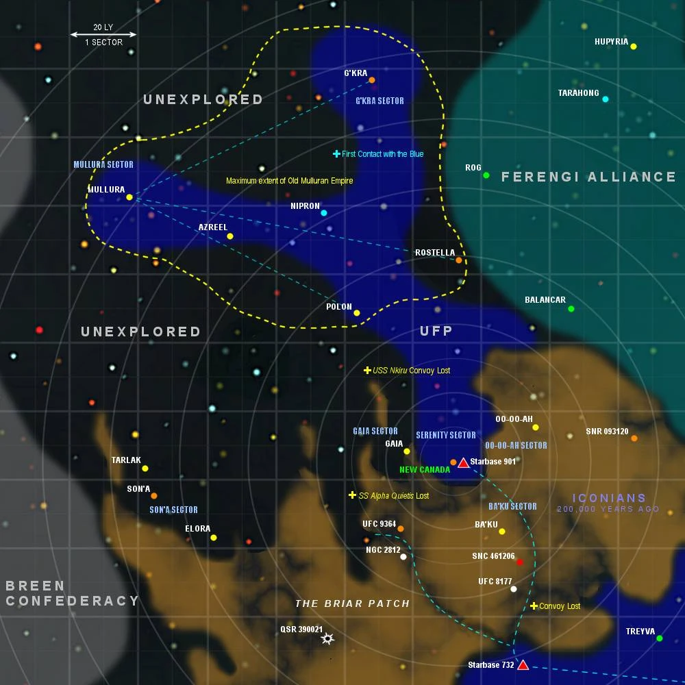The Trans-Briar Patch sectors are home to the Son'a and their allies, the Elora and the Tarlac. The remnants of the Mulluran Empire are also here, wedged between the Ferengi Alliance and the Breen Confederacy. Other systems formerly under the control of the Mullurans include Polon, Rostella, and G'Kra.
