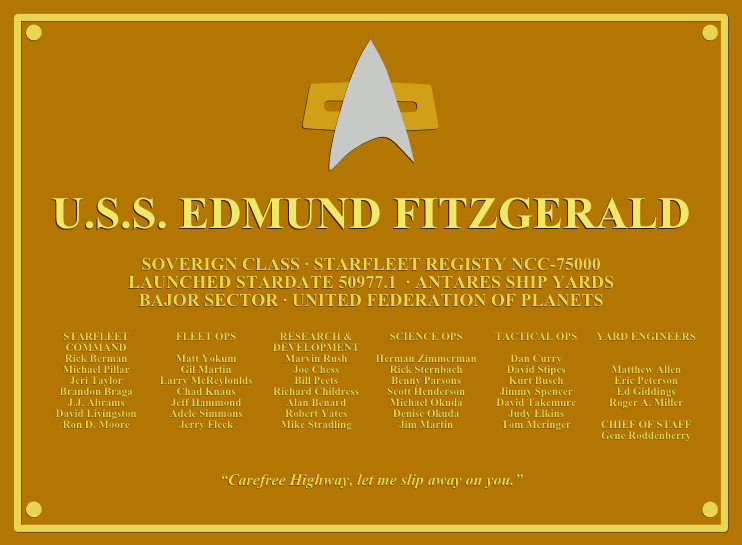 The USS Edmund Fitzgerald (NCC-75000) was a Sovereign-class Federation starship in service during the late 24th century. The Fitzgerald is named in honor of an ore freighter that sank in bad weather on Lake Superior in the late 20th Century, which inspired the song The Wreck of the Edmund Fitzgerald by Gordon Lightfoot. (USS Baldwin: "Wartime Productions")