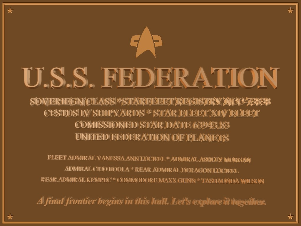 The USS Federation (NCC-73838) was the flagship of the 14th fleet. Commissioned in 2386, and under command of Fleet Admiral Vanessa Lucifel, it is the most powerful starship in the sector. This is only the Second ship in Starfleet history to bear the name Federation. (Star Trek Crusader)