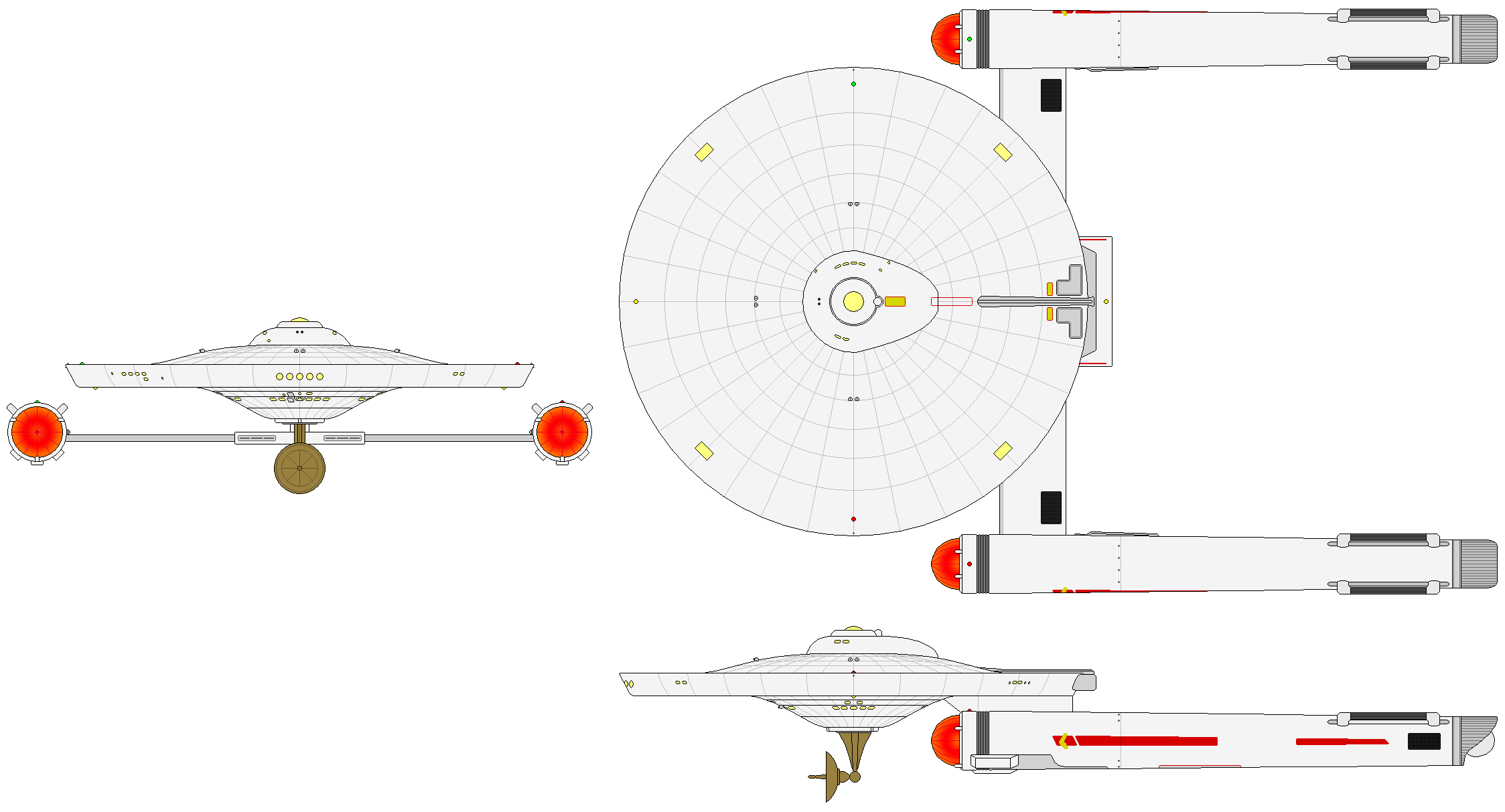 In 2250, the remaining Sivas and Saladin vessels, as well as eight Monoceros from the Hermes-class scouts, received upgrades of the external hull, warp nacelle, pylon, and weaponry. The new PB-32 nacelle provided cruise and maximum speeds of warp 6 and warp 8, while the weaponry was completely replaced: the torpedo systems were modified to support forced-intermix warhead supply equipment and the six phase cannons were replaced by an equal number of less massive—but far more adaptive—Type VII phaser emitters. The bridge was provided a lower target profile by being “sunk” half a deck into the surrounding superstructure. And, for utilitarian purposes, a powerful tractor beam emitter was mounted on the pylon’s trailing edge, midway between the saucer and the nacelle.