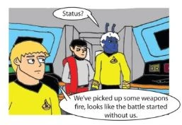 With this new technology Banner helped save Star fleet intelligence was able to find a new weapons platform being built by the Klingons. Commodore April ordered an assault on the Kathra system. The USS Roosevelt lead the first wave of the assault, the Hannibal manned the left flank, the Eagle the right, and the Enterprise in the center reserve. The Roosevelt lost nine ships in their attack group by the time the Enterprise arrived to assist.
