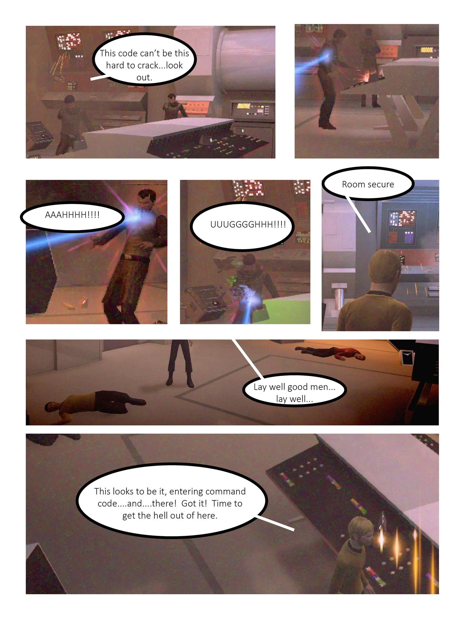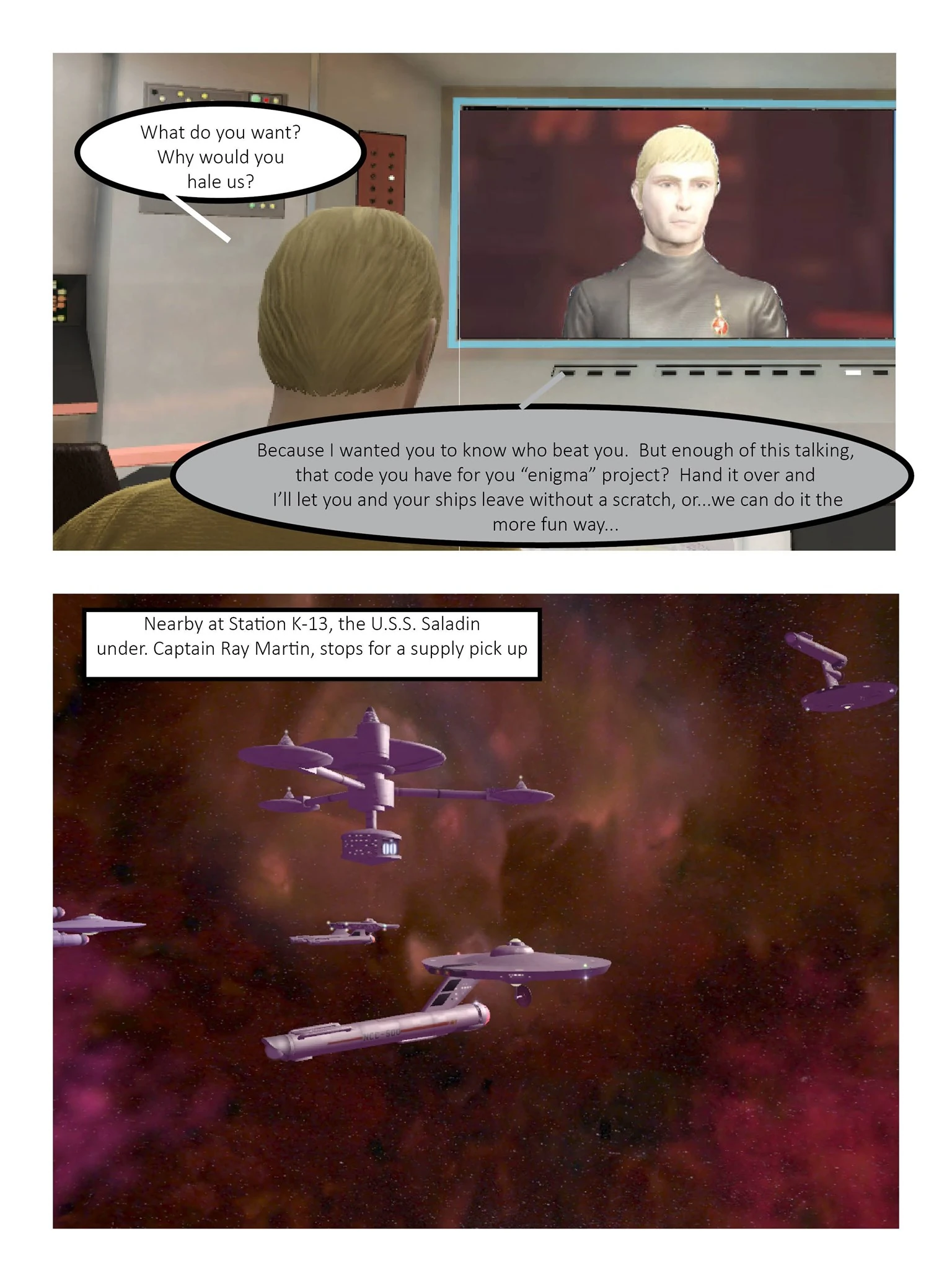 The group of scientists were rescued by Banner and the USS Eagle (NCC-956) after an intense set of fire fights both around the crash site and inside the crashed ship itself. Banner was able to find the device the scientists were working on, a long-range code braking machine, and return to the Eagle. But once in orbit the Eagle was ambushed by a Klingon task force, to banner's surprise it was under the command of his counterpart from the mirror universe, the same who he thought he had left in Starfleet captivity. Fortunately they were driven off with the help of Ray Martin and the USS Saladin (NCC-500).