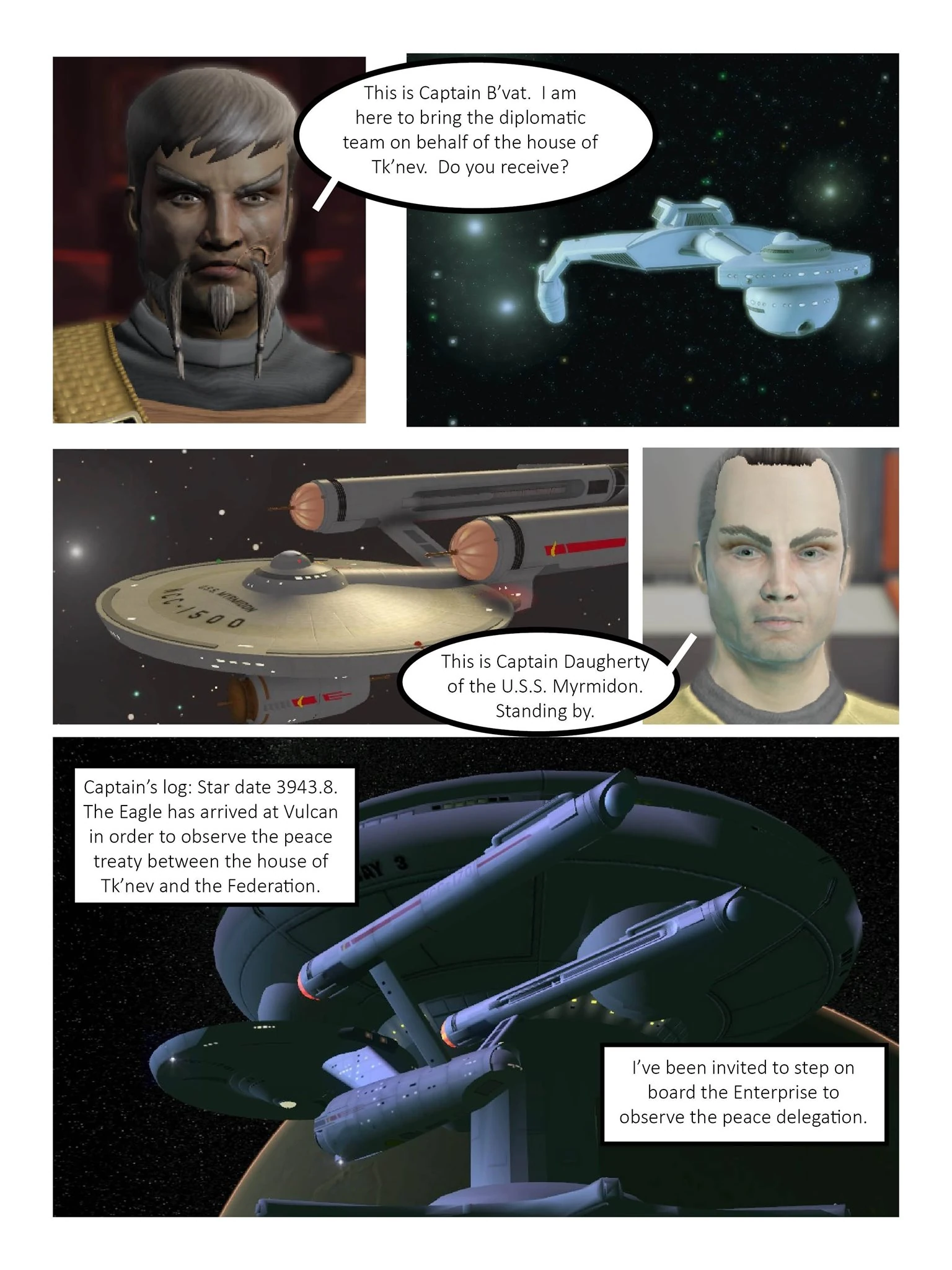 Two week into the conflict the situation for the Eagle was not going well. Mr. Elberg's crew was working around the clock to keep the ship in the fight and Banner had lost several of his crew, including Lt. Kinzler, a crew member who was the son of one of his former commanding officers on the Macarthur. Soon after the federation task force was nearly whipped out while they were escorting the USS Yiannopoulos, a ship that was caring a group of scientist who had with them a new classified project that was believed could turn the war in the federation's favor. Once the Eagle proceeded to clear the planet's orbit of the Klingon ships, including a destroyer and two D-7s.